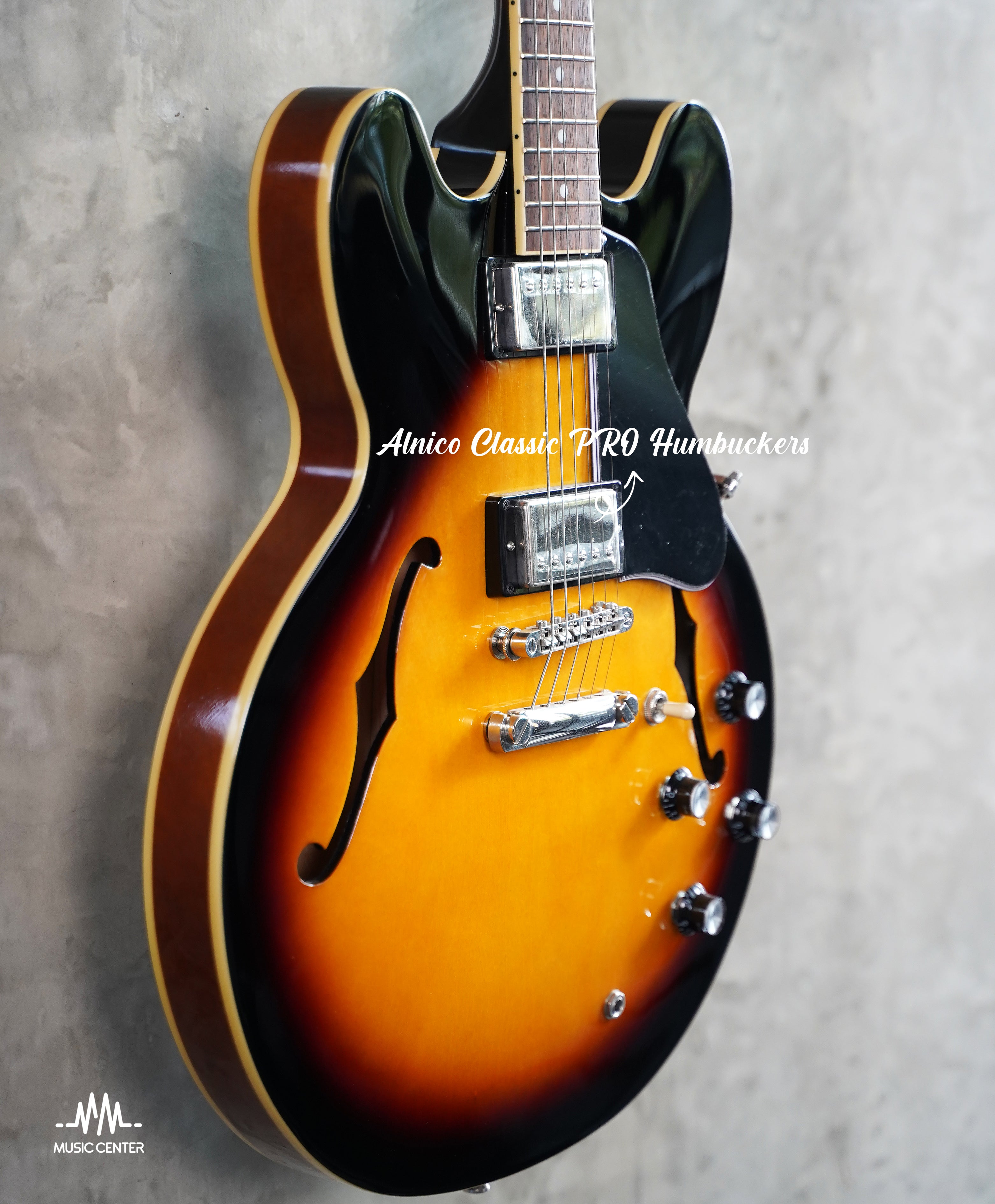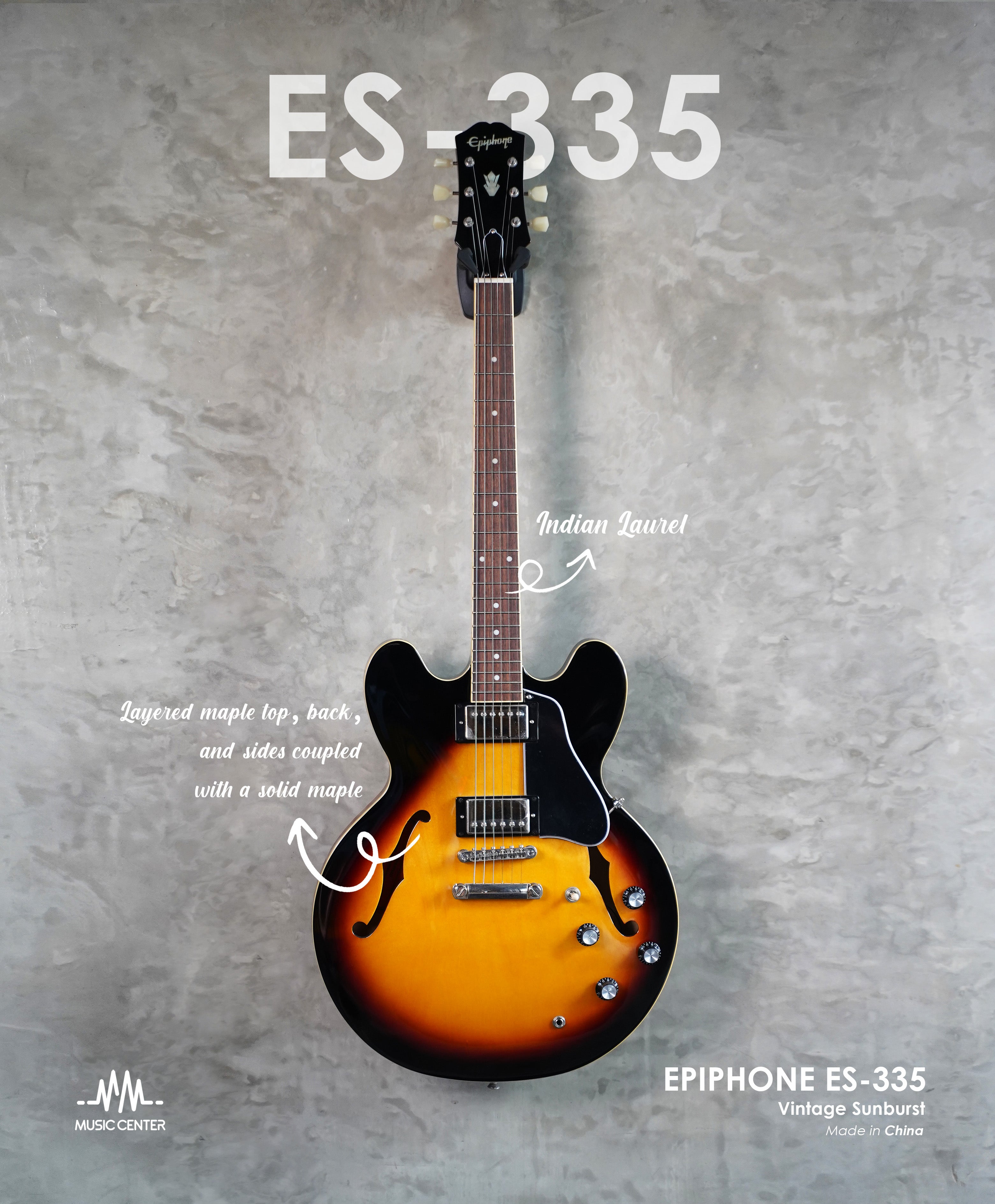 The ES-335 is Epiphone's version of the historic ES-335 that has been wowing guitar players all over the world for over six decades. From its inaugural appearance in 1958, the Gibson™ ES-335 set an unmatched standard. Our Epiphone ES-335 is no exception. It is simply one of the best deals today for guitar players who want the classic sound of an ES-335 at an accessible price. The ES-335 is crafted with a layered maple top, back, and sides coupled with a solid maple tone block to create the amazing sustain, warmth, and resonant tone that players crave in a semi-hollow instrument. Epiphone's Alnico Classic PRO™ Humbuckers deliver a wide range of vintage sounds while the rounded C neck profile is extremely comfortable and easy to play, and the headstock features the 60s style Kalamazoo shape. Optional hardshell or EpiLite™ Case available.
